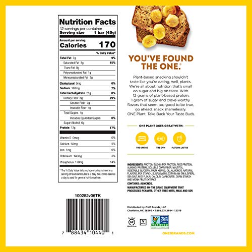 PLANT-BASED PROTEIN, JUST 1G SUGAR, NO REGRETS: Healthy indulgence is now plant-based in our newest ONE Plant Protein Bars Whichever ONE PLANT Protein Bar flavor you grab, from Chocolate Peanut Butter to Banana Nut Bread, you’ll be getting 12g of protein, 1g of sugar and zero regrets Our ONE Plant snack bars are a perfect snack when your energy is low
