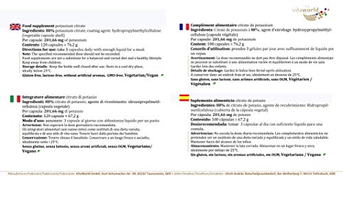 Specification: Vita World Kaliumcitraat 605 mg dagelijkse dosis, 120 capsules, apothekenproductie, kaliumcitraat