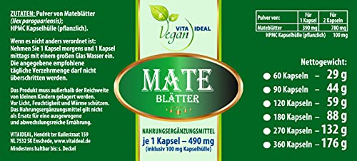 Specification: Vitaideal Vegan® Mate bladeren (Ilex paraguariensis) 60 plantaardige capsules van elk 490 mg zuiver natuurlijk zonder…