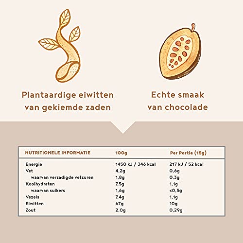 Specification: Vegan Protein – Chocolade – Plantaardig proteinen van gekiemde rijst, erwten, lijnzaad, amaranth, zonnebloempitten…