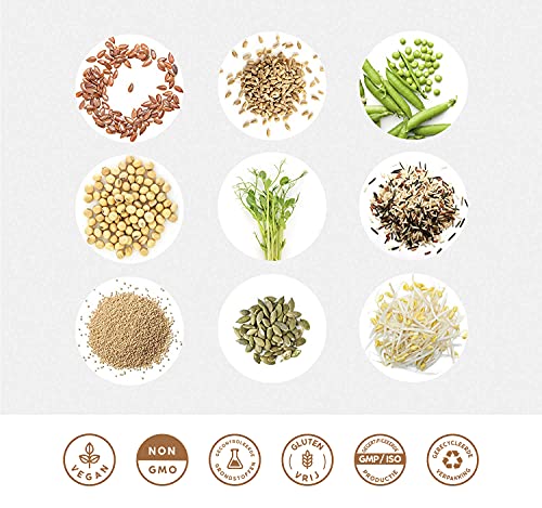 Plantaardig proteinen: we gebruiken alleen plantaardige eiwitten van gekiemde gele erwten, bruine rijst, zonnebloempitten, lijnzaad en andere zaden en bonen voor een rond, complex en zeer biologisch beschikbaar eiwitpoeder. De combinatie van deze verschillende plantaardige eiwitten resulteert in een zeer aangename & romige consistentie.